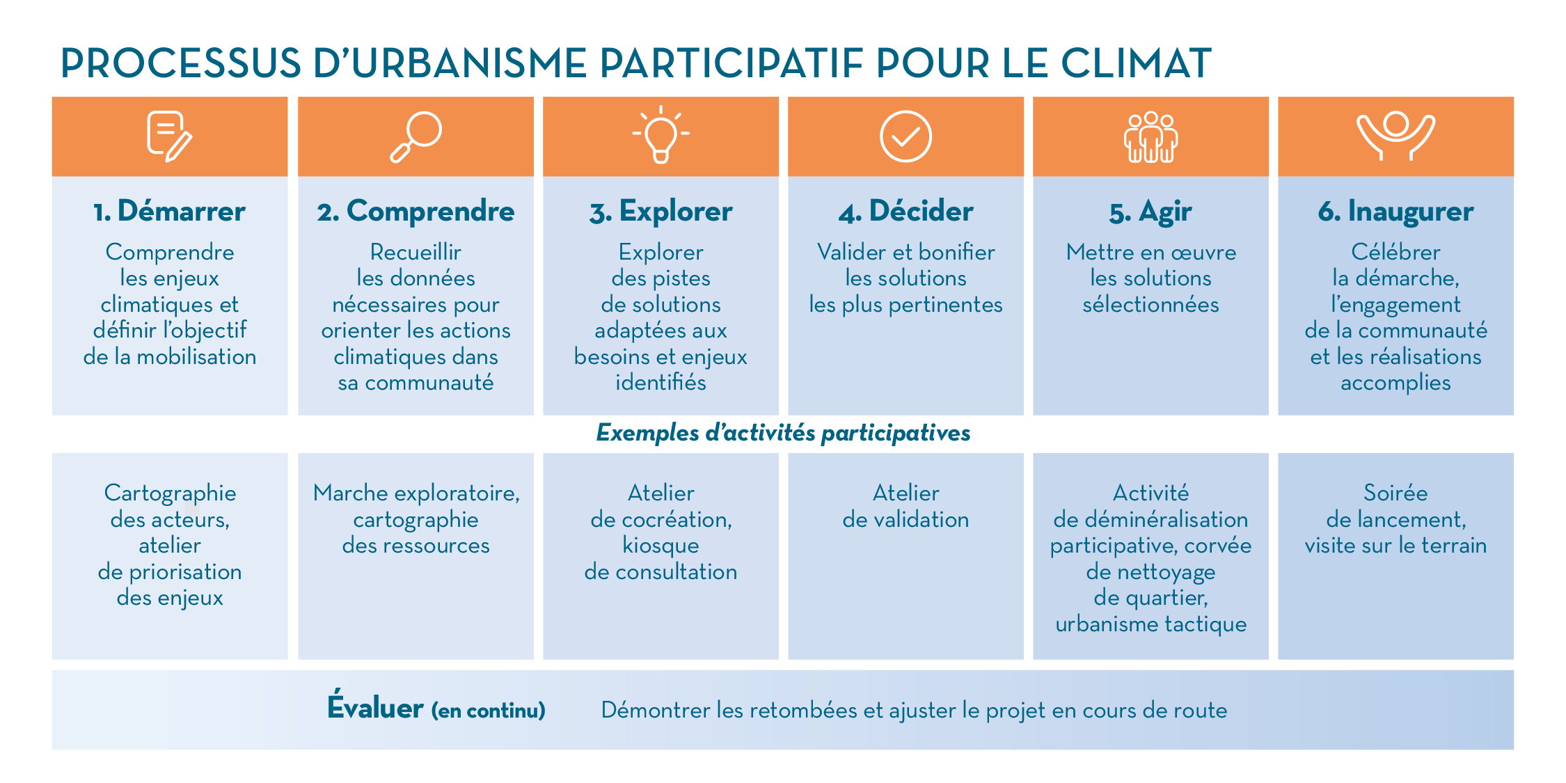 Cette page présente les grandes étapes du processus, ainsi que des outils de connaissances et des activités participatives à réaliser avec la communauté afin de coconstruire des milieux urbains plus résilients, où il fait bon vivre.